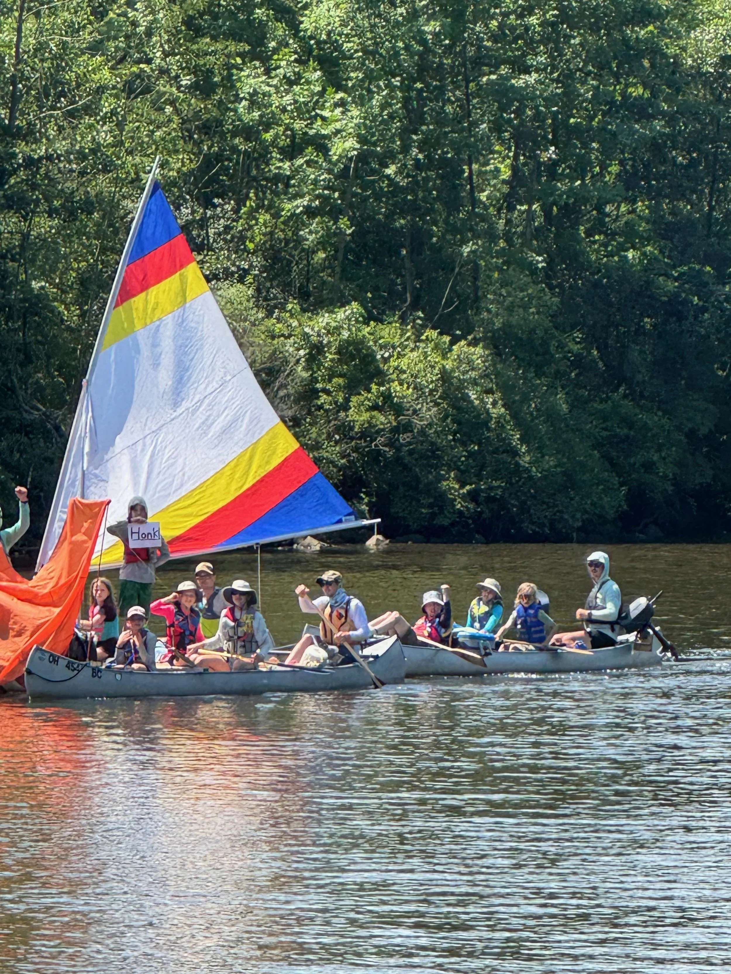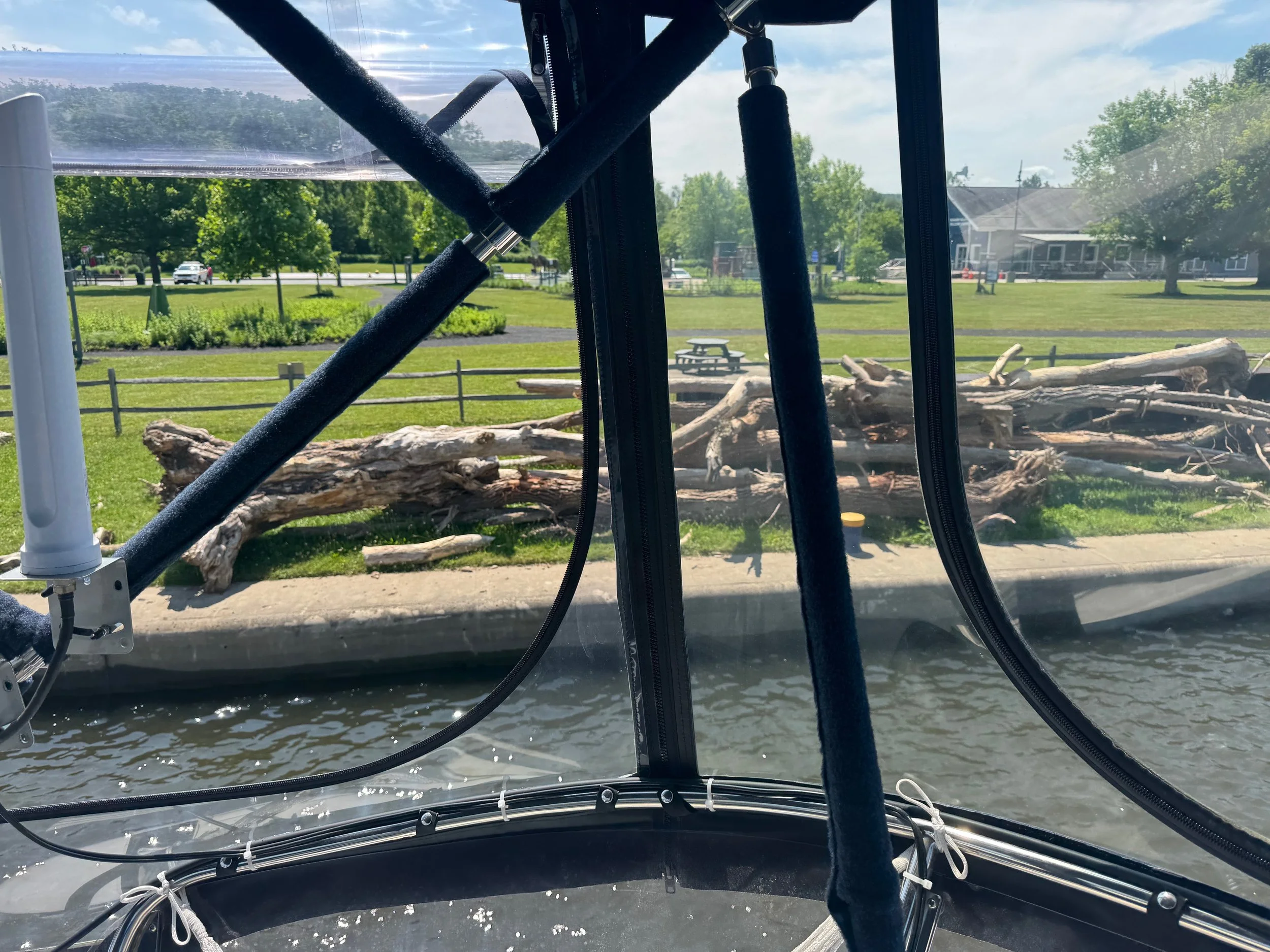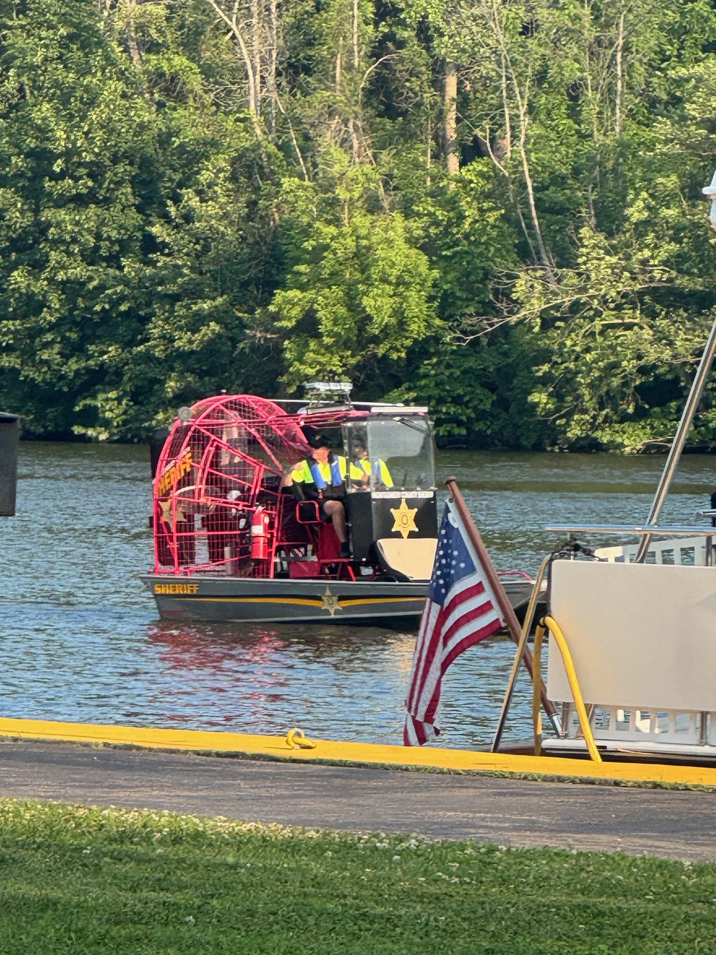 Beautiful day to make about 27 miles where we docked on the Saint Johnsville Municipal Marina wall and it seems like we saw it all today. There were rolling hills, religious shrines, a cut through the hills made by the Mohawk River with the Erie Canal in the middle, Interstate 90 on the south shore, regular trains rolling by on the north shore, all brought together in the narrow cut. Since I-90 is within yards of the canal, there was the ever present McDonalds at a truck stop, and There were several duck crossings, kind of like deer crossings but not signed, and an interesting afloat camp with two canoes powered by a Sunfish and a makeshift spinnaker filled with kids who, of course, wanted us to blow the boat’s horn. We were also entertained in Saint Johnsville by the local Sheriff’s office water patrol who were on training with two officers on jet skis, two officers in an aluminum skiff and two officers in an airboat, running up and down the canal making a lot of noise.