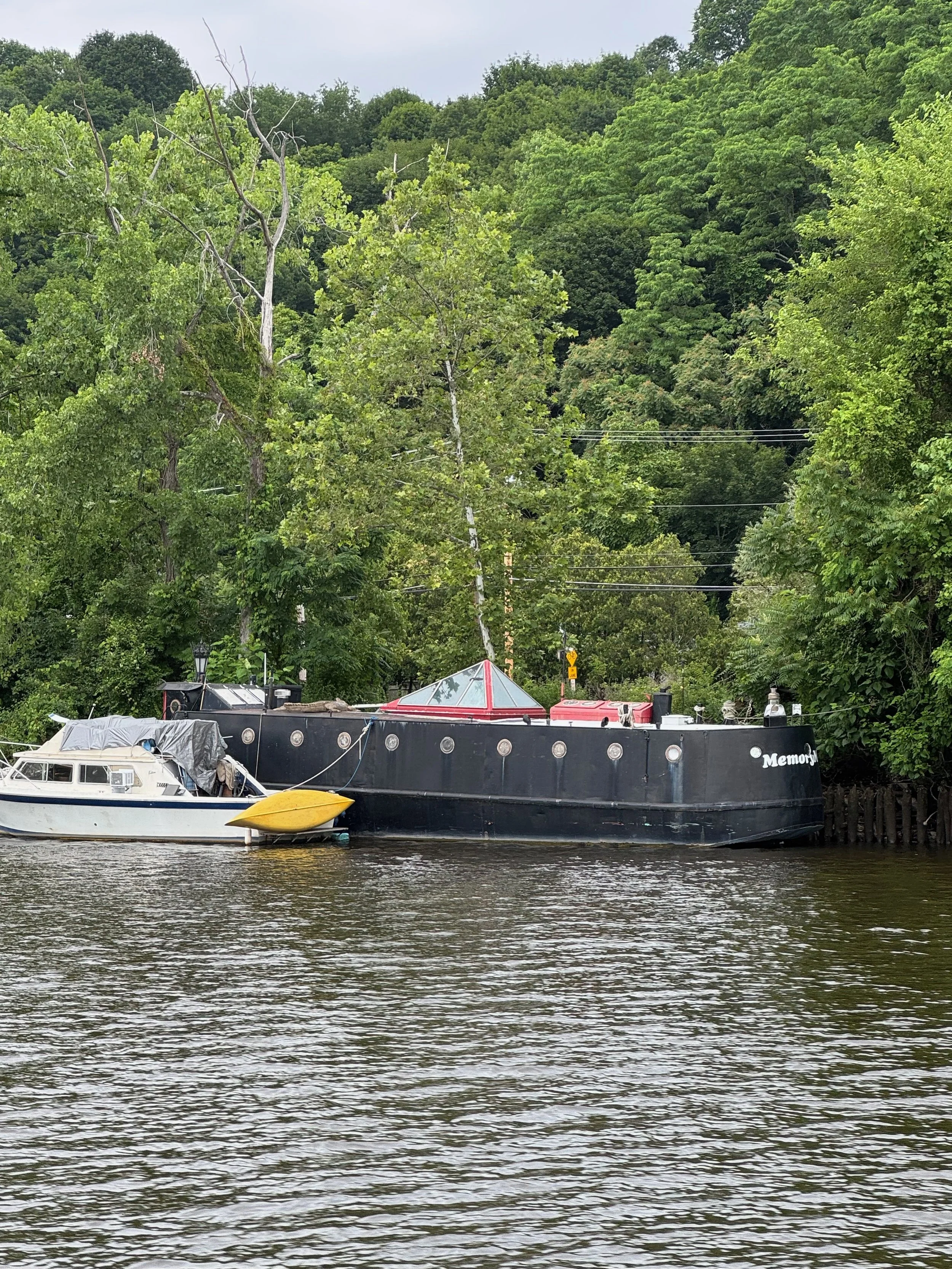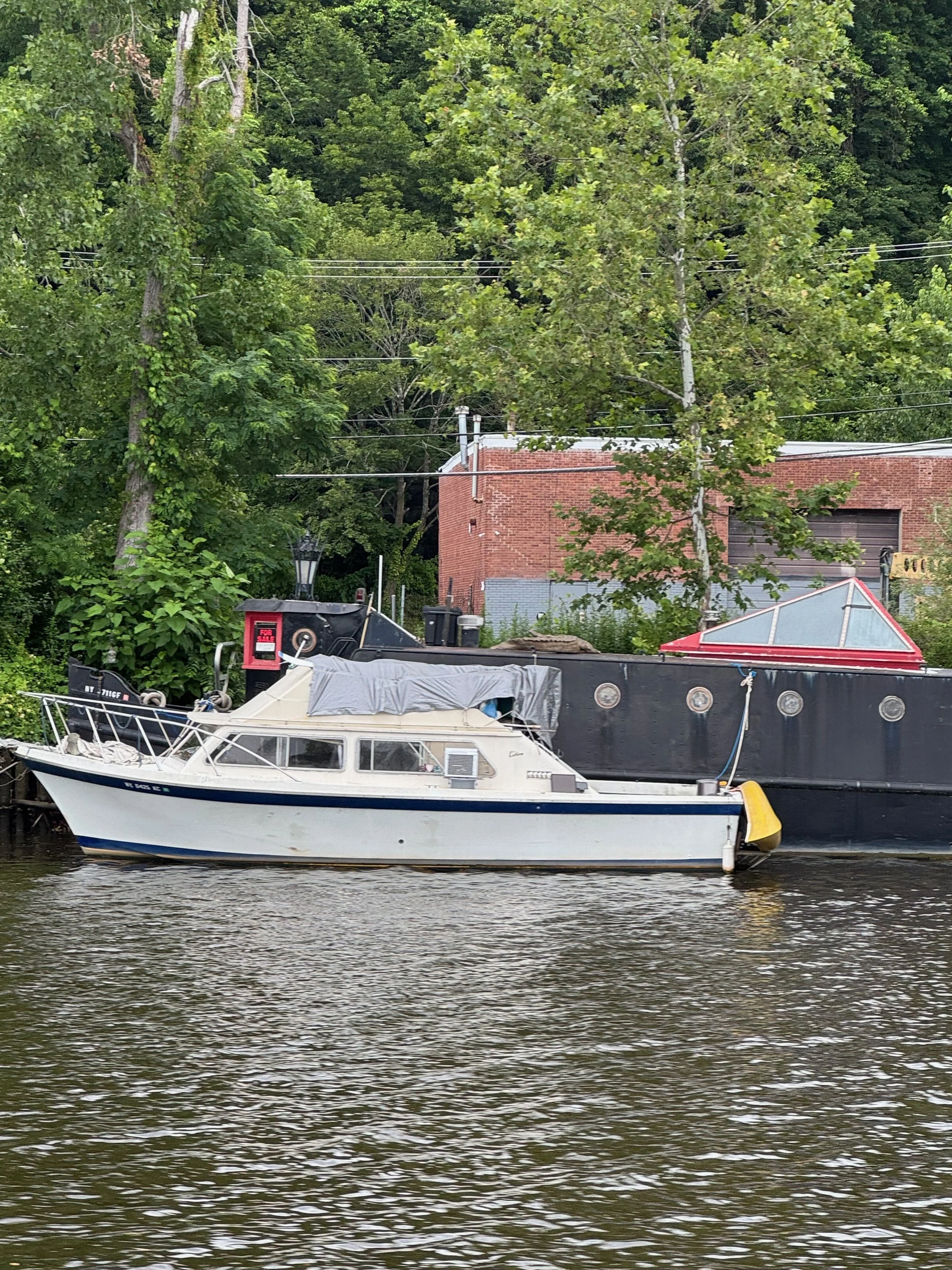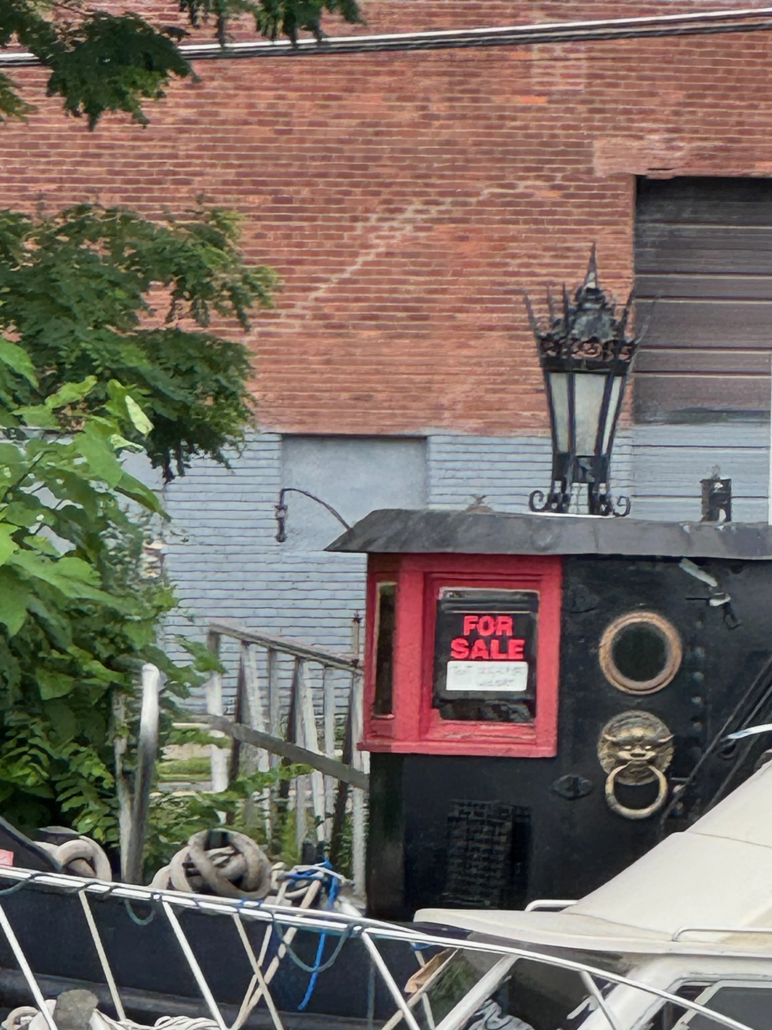 Leaving Kingston harbor , we spotted what could be the retirement home of our dreams (see pics). It was the door knocker that sold me - and it comes with a canoe, AND a small runabout with an air conditioner! 👍 NICE! All we can do is hope it’s still for sale when we come back by in Sept. LOL