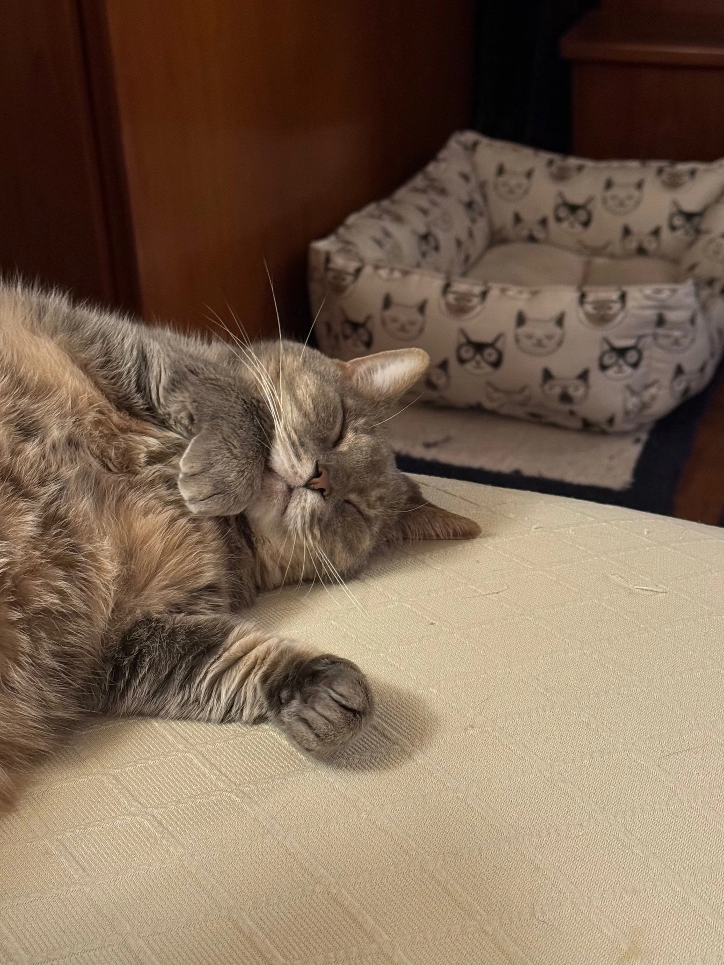 when we turn on the engines she heads for our state room and either curls up on our bed or crawls up in her bed on top of the closet and doesn’t move until we stop.