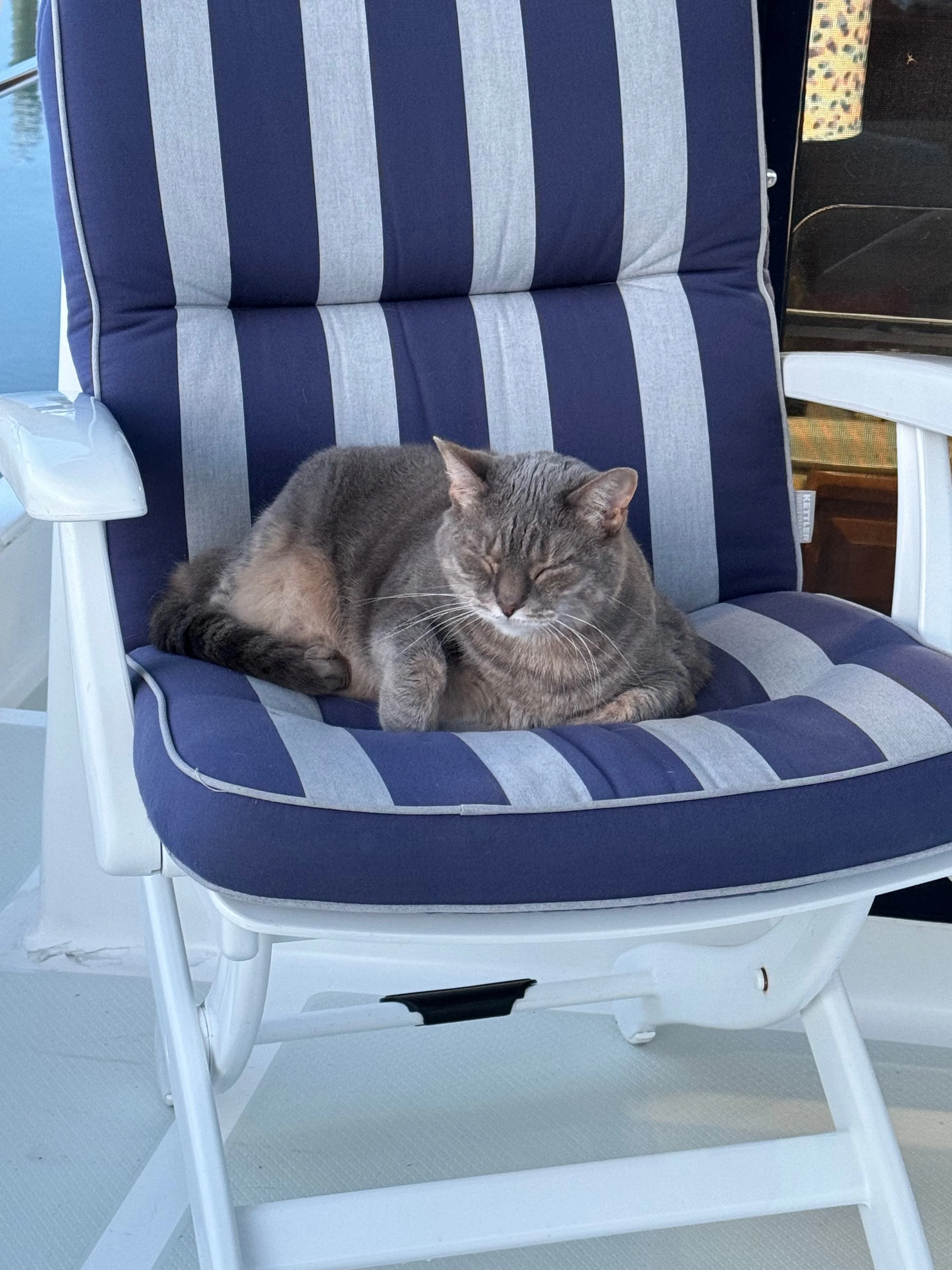 When we stop for the evening, she comes up to the salon, hangs out with us or goes out on the deck and lounges on one of our deck chairs.