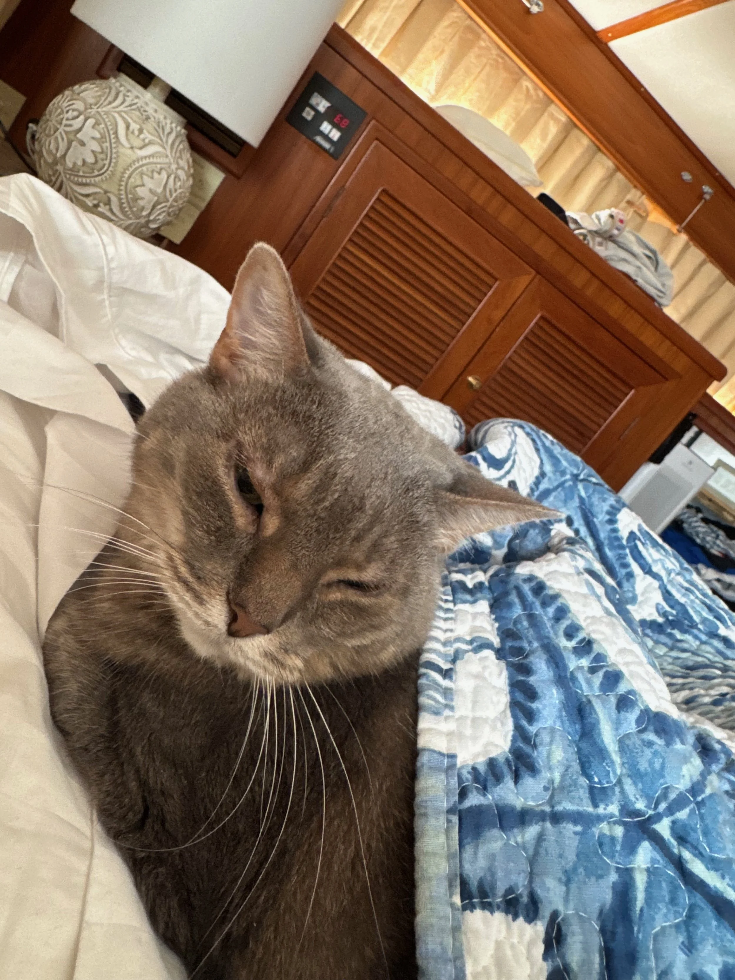 At all times when we are under way, and it’s hot, we run the generator and the a/c to ensure she is comfortable inside the cabin while she watches Love Island or Below Deck. She pretty much lives a life of leisure and seems happy. We still don’t know whether she can swim though, and although we have a lifejacket for her, she is not a big fan.
