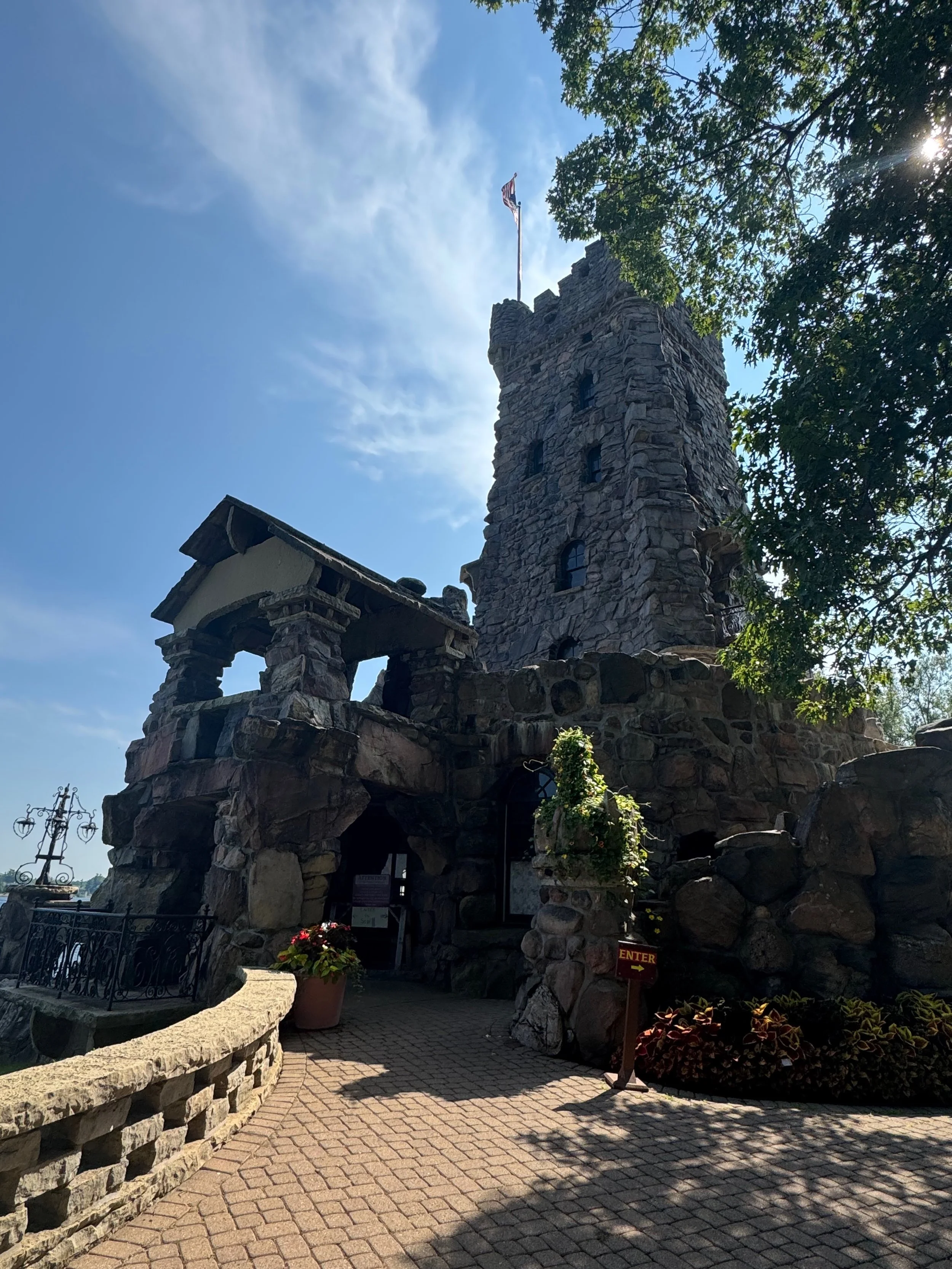 After we arrived we went to see Boldt Castle on Heart Island. We biked a whopping 0.83 miles to the Boldt Castle Yacht House to catch the shuttle over to Heart Island. We kind of said, “We’ve seen castles before,” but changed our mind and it was well worth it. Long story short, George Boldt grew up in the gilded era, went from a kitchen worker to owning hotels culminating with the Waldorf-Astoria in Manhattan. Became a millionaire and built Boldt Castle for his wife who, tragically, died before the castle was finished and construction stopped. Boldt never visited Heart Island again. Castle went into disrepair until the Thousand Island Bridge Authority took it over and restored it. Still restoring but it was amazing. When they stopped construction some of the materials (such as the crown molding) were simply crammed in the basement or the kitchen, still in their shipping crates.