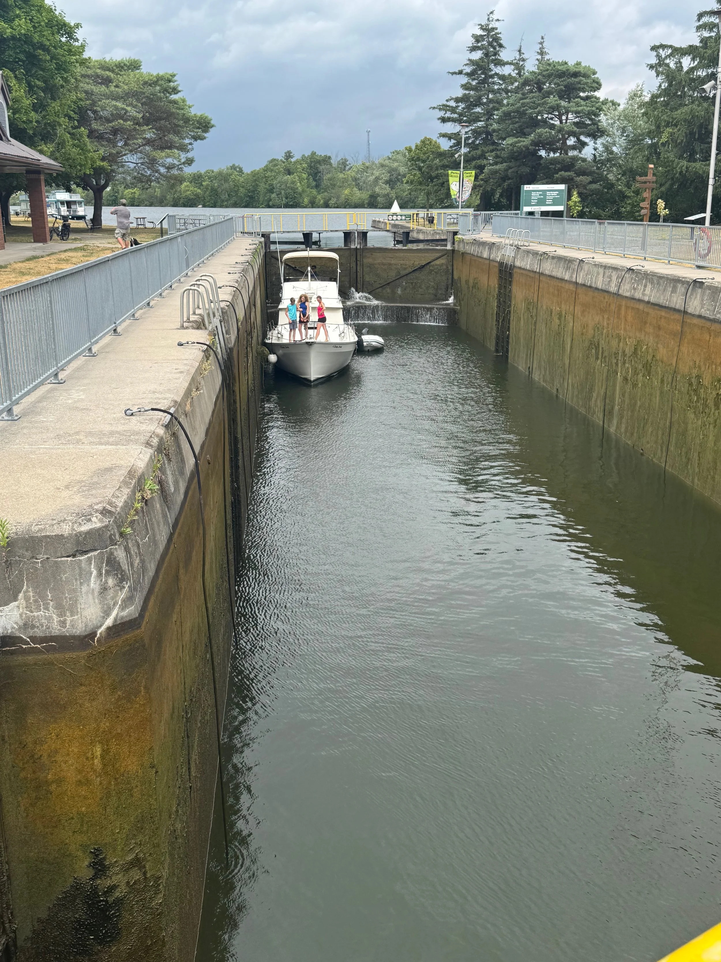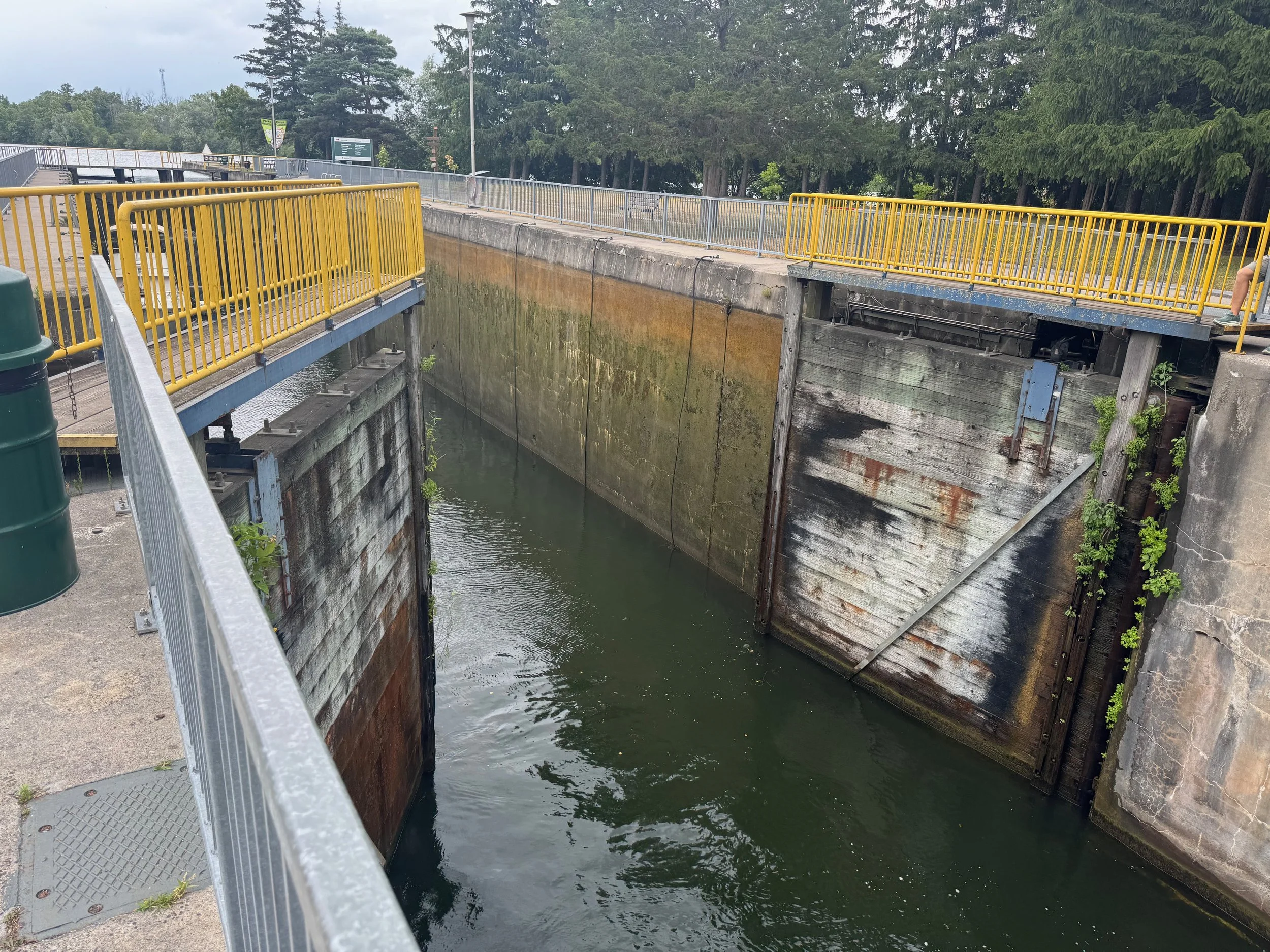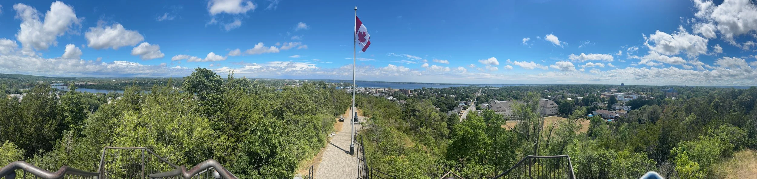This afternoon Will rode a bike about two miles from where we are docked to look at our first Canadian lock (Lock 1). Having not been through a lock in Canada yet, it’s always good to see what you are up against since we have read the Canadian lock keepers have their own way of doing things but, are very helpful. Also, many of the locks on the Trent Severn have manually operated gates on one or both ends. Lock 1 has manual gates at the north end and you can see in the video below the lock tenders operating the gates. After the lock, Will rode up (with significant assistance from the electric bike) to a Trenton hilltop with a memorial and a spectacular view of the town, bay and canal.