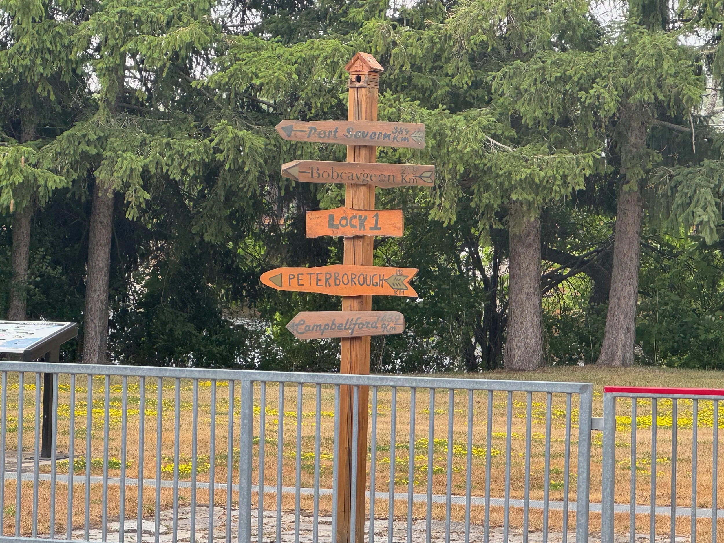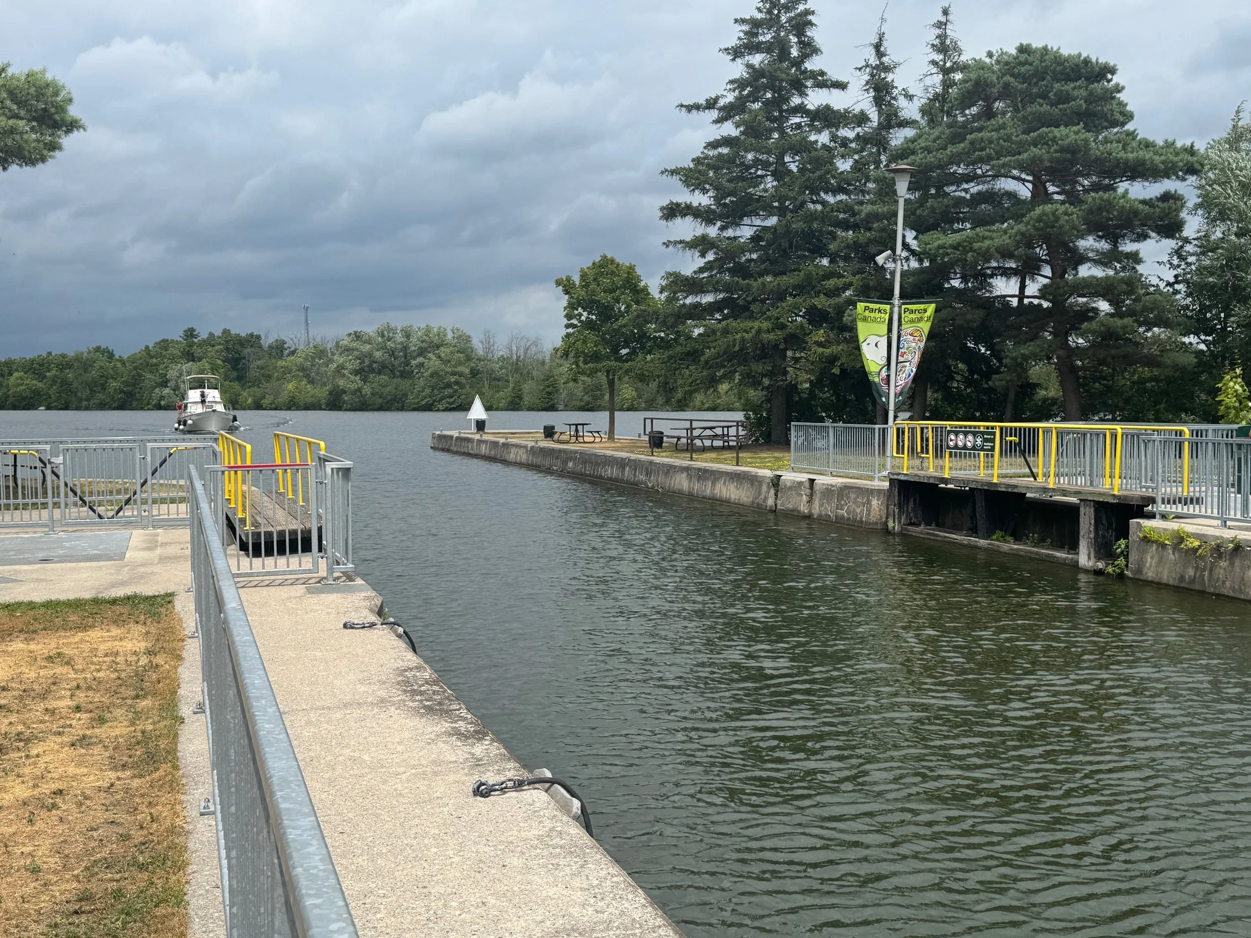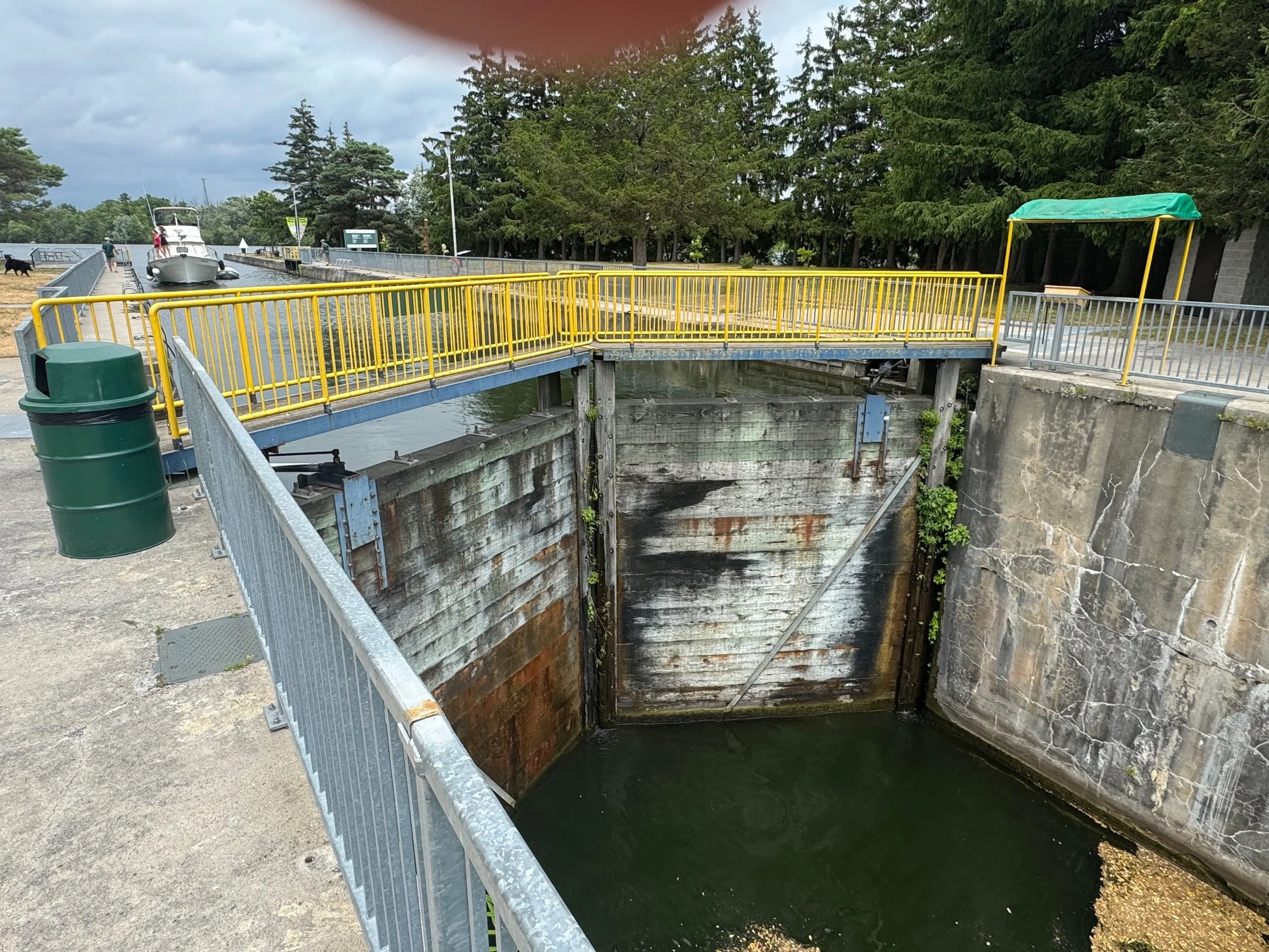 This afternoon Will rode a bike about two miles from where we are docked to look at our first Canadian lock (Lock 1). Having not been through a lock in Canada yet, it’s always good to see what you are up against since we have read the Canadian lock keepers have their own way of doing things but, are very helpful. Also, many of the locks on the Trent Severn have manually operated gates on one or both ends. Lock 1 has manual gates at the north end and you can see in the video below the lock tenders operating the gates. After the lock, Will rode up (with significant assistance from the electric bike) to a Trenton hilltop with a memorial and a spectacular view of the town, bay and canal.