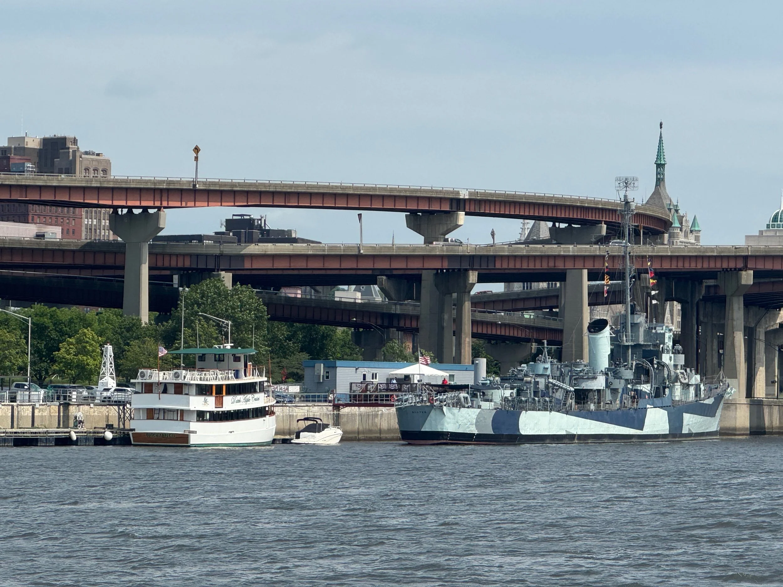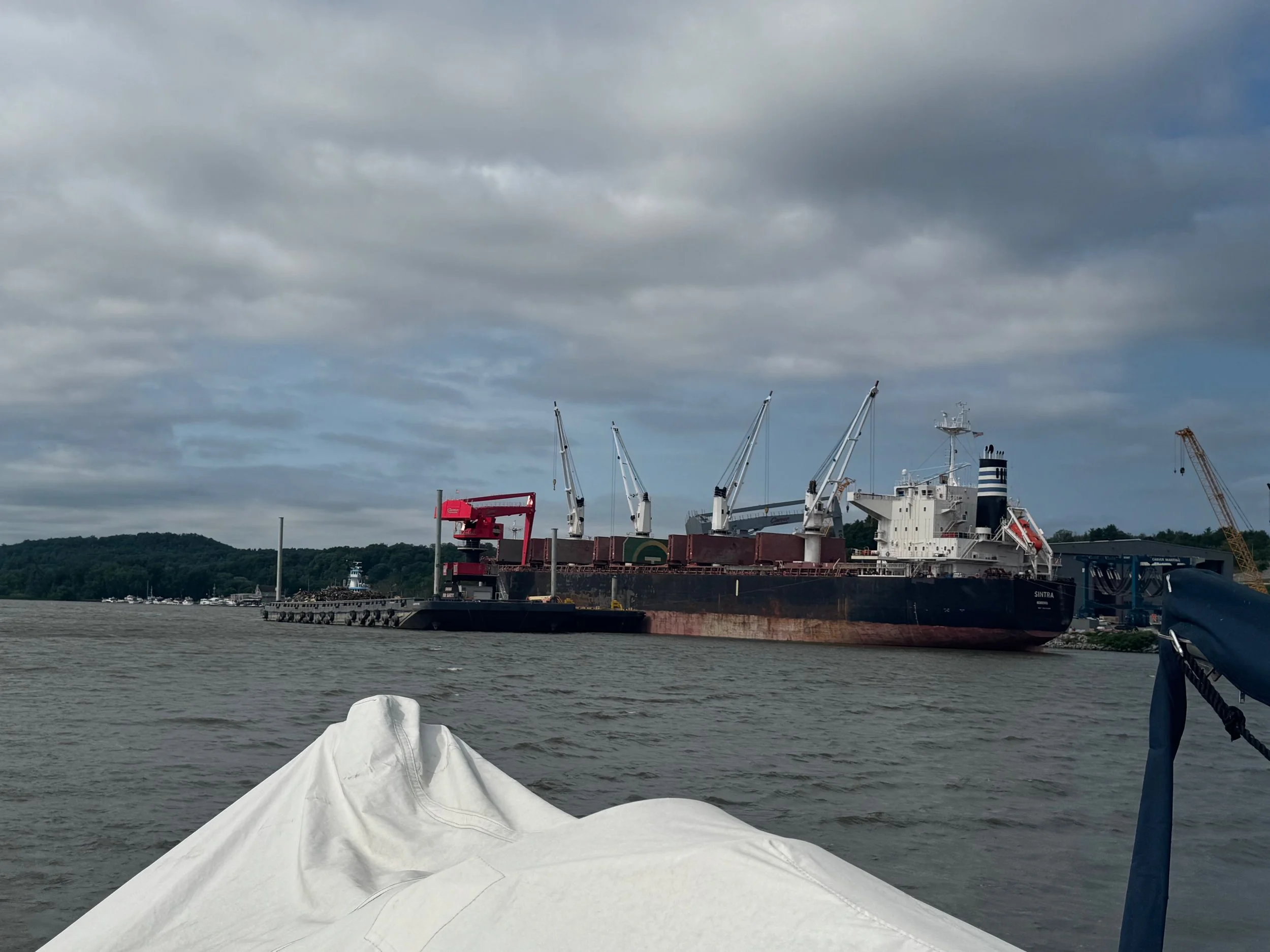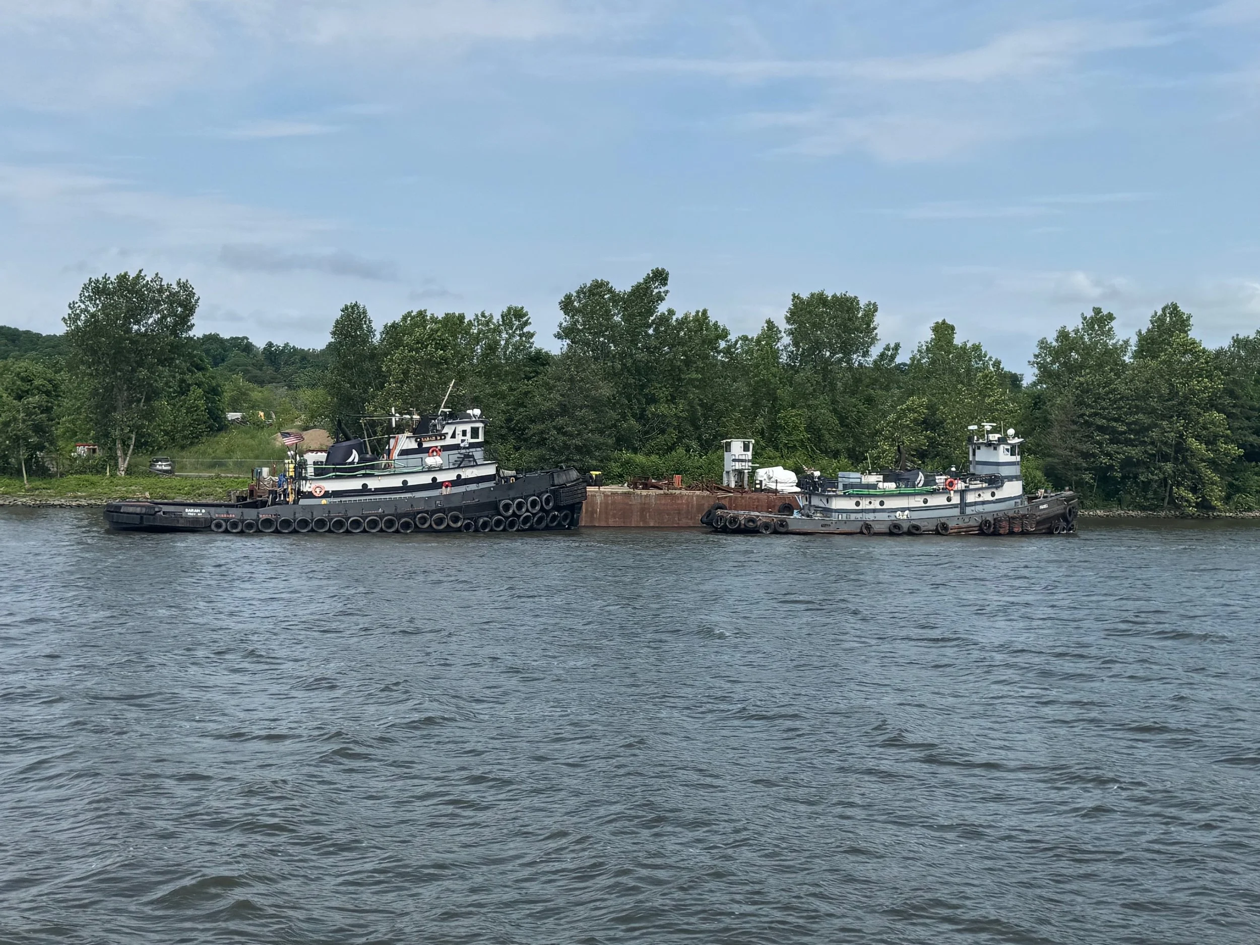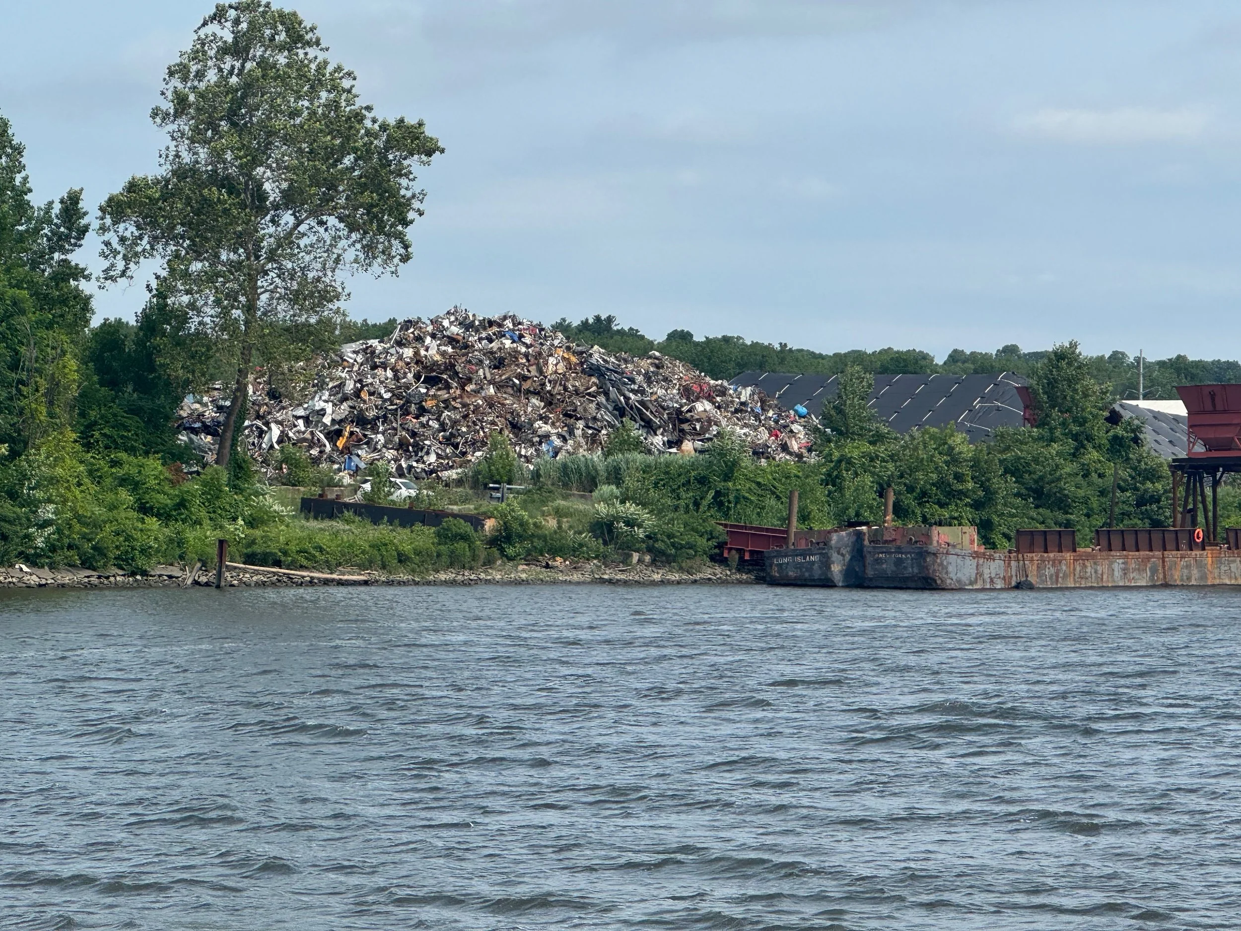 As we cruised up the Hudson from New Baltimore to Troy, we saw everything from flocks of geese lounging in the river to builders of beautiful boats, a World War II destroyer escort, USS SLATER in Albany, the Albany skyline and HUGE piles of scrap metal being loaded into bulk carrier SHIPS (not barges) at the Port of Coeymans to be hauled down the Hudson to who knows where. All we could think of was the effort that went into the making of whatever it was that was now scrap requiring disposal. We also saw some debris and branches up high on the bridge supports that showed how high the water was in the past couple of weeks due to the heavy rains.