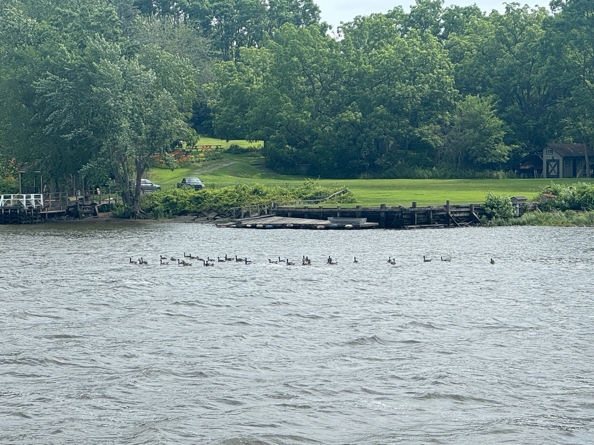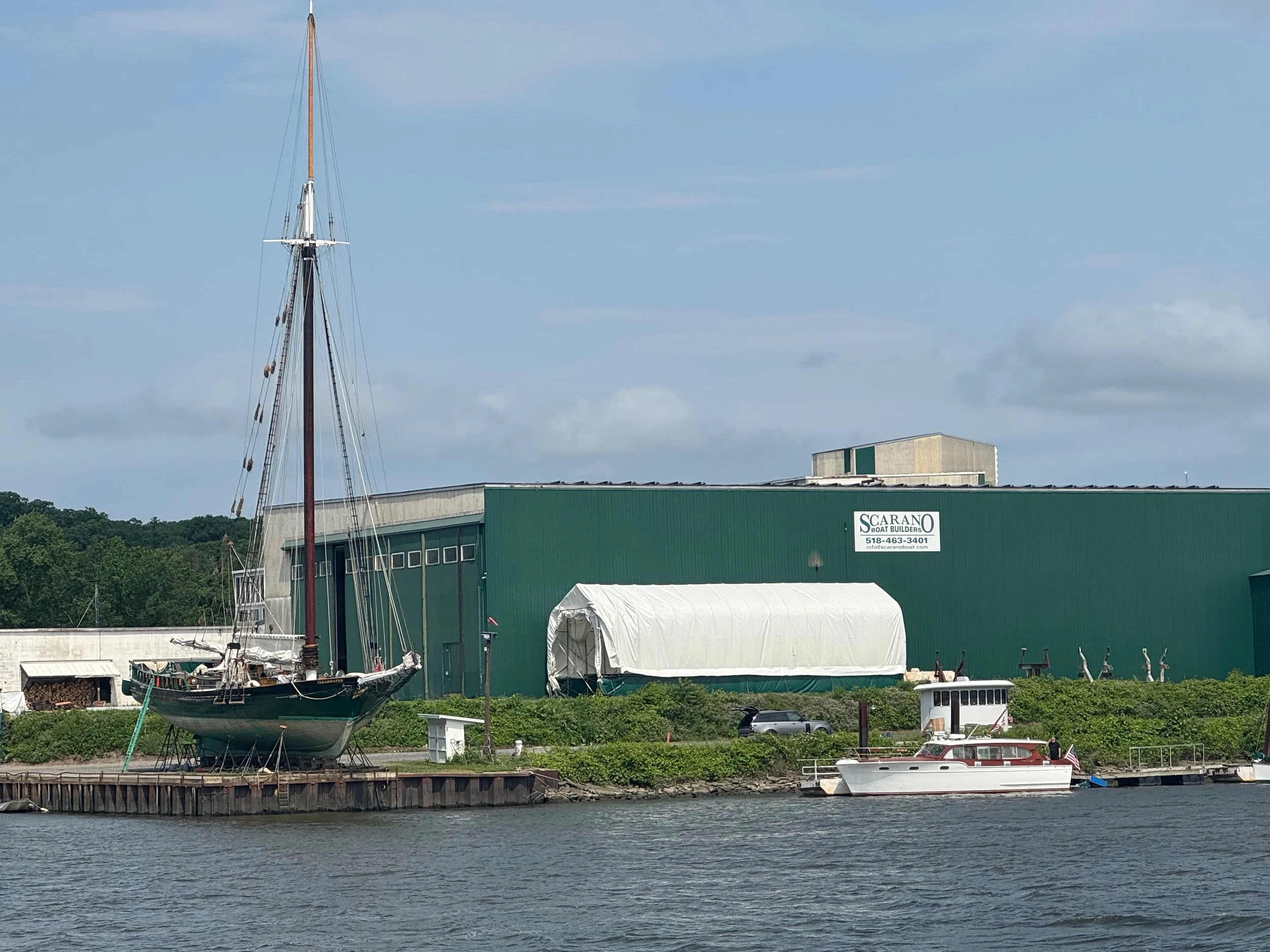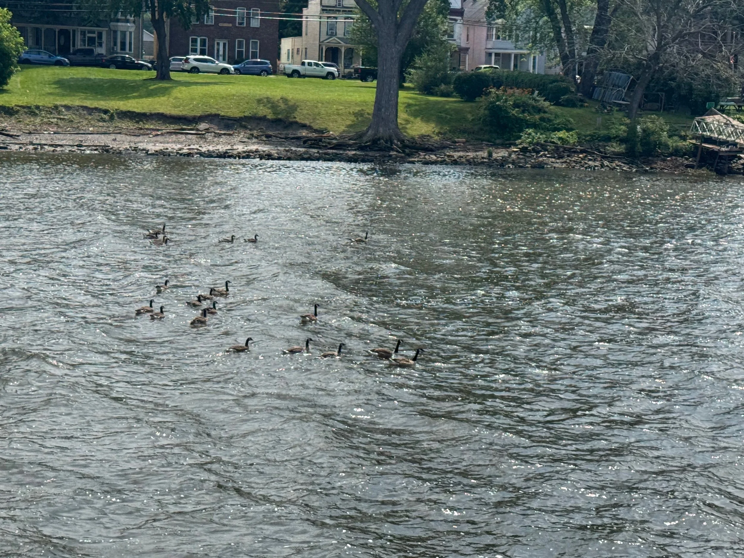 As we cruised up the Hudson from New Baltimore to Troy, we saw everything from flocks of geese lounging in the river to builders of beautiful boats, a World War II destroyer escort, USS SLATER in Albany, the Albany skyline and HUGE piles of scrap metal being loaded into bulk carrier SHIPS (not barges) at the Port of Coeymans to be hauled down the Hudson to who knows where. All we could think of was the effort that went into the making of whatever it was that was now scrap requiring disposal. We also saw some debris and branches up high on the bridge supports that showed how high the water was in the past couple of weeks due to the heavy rains.