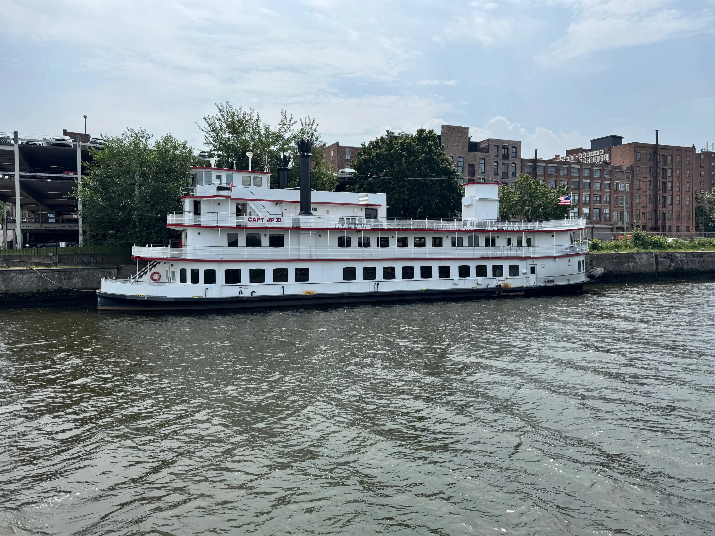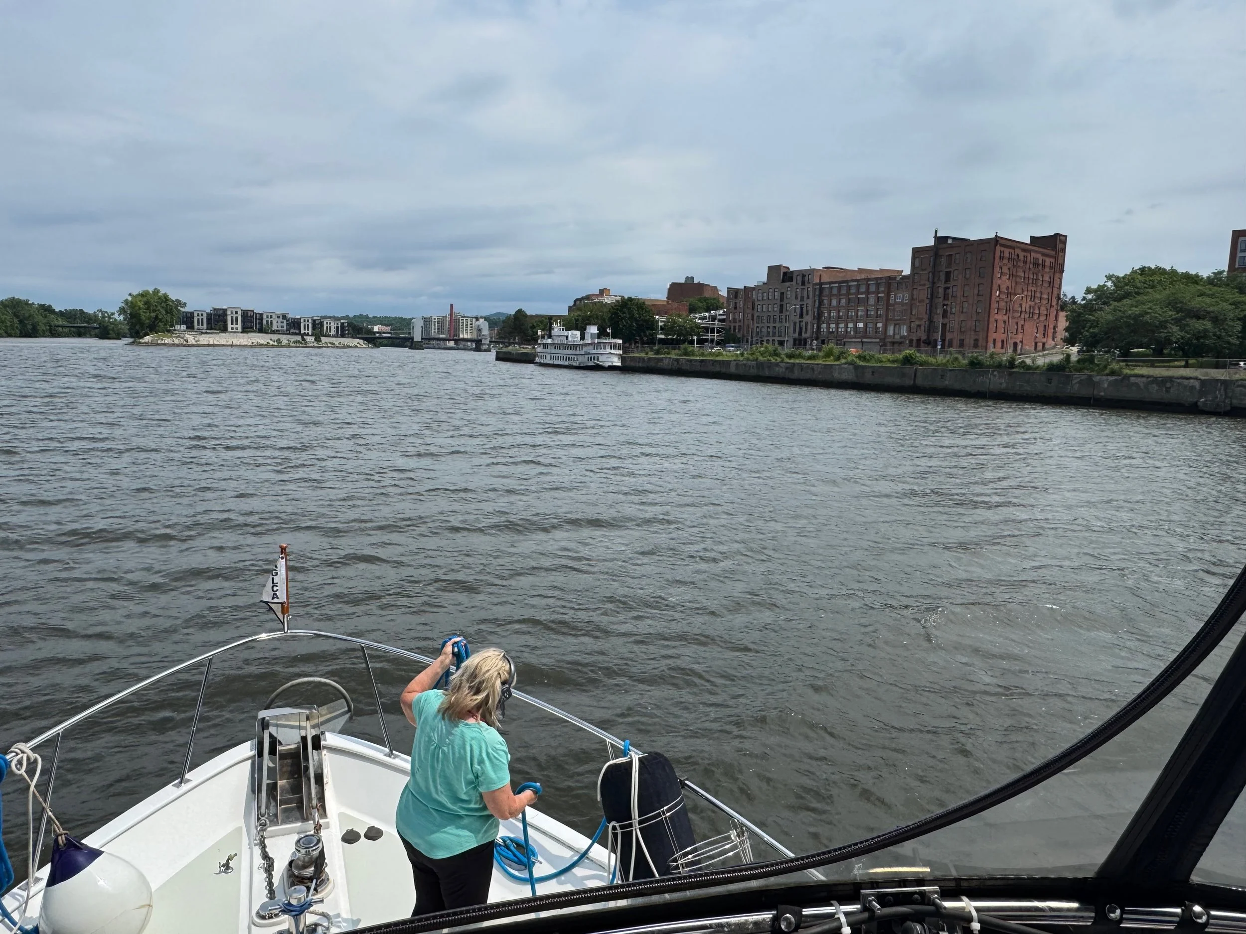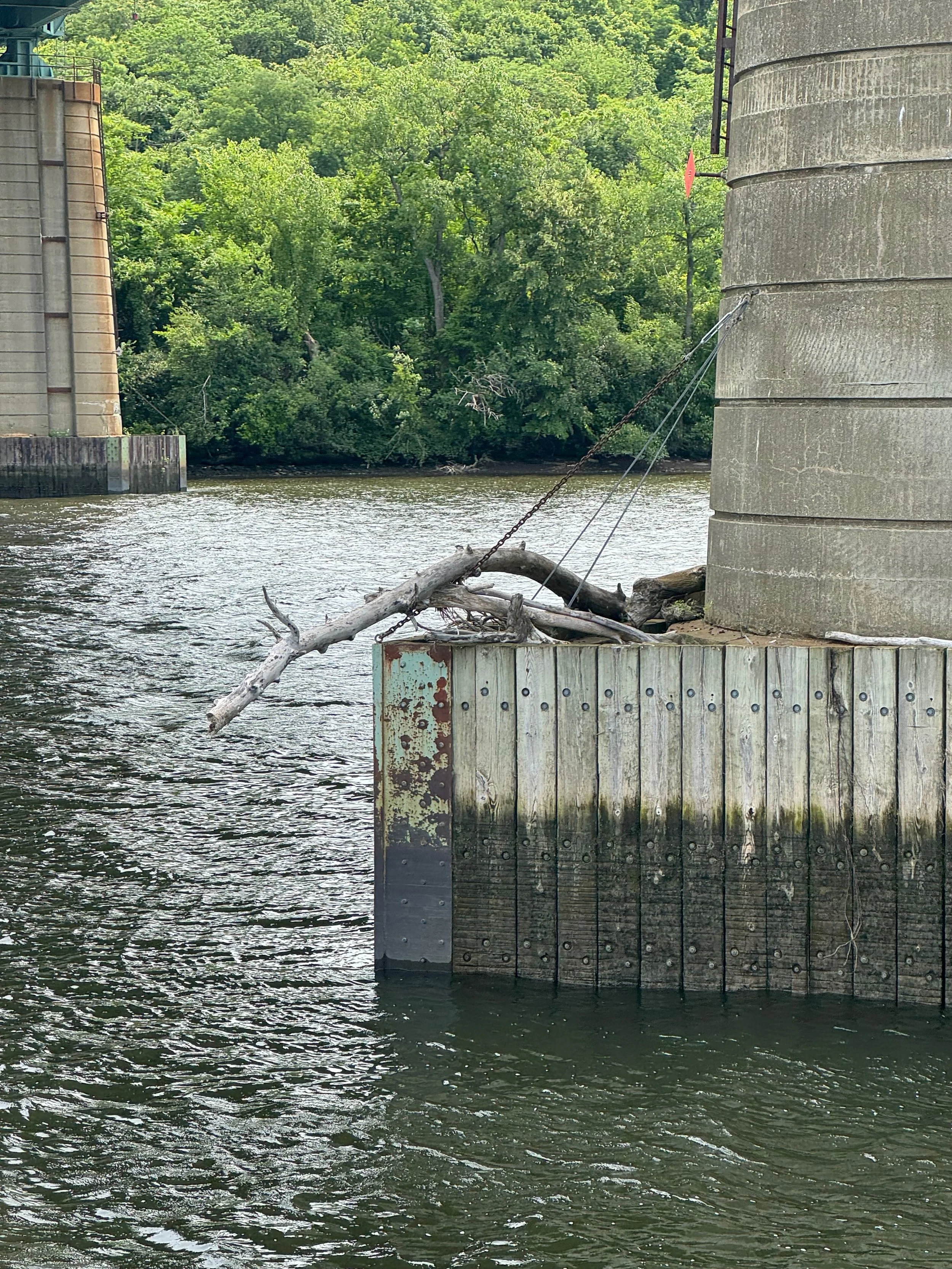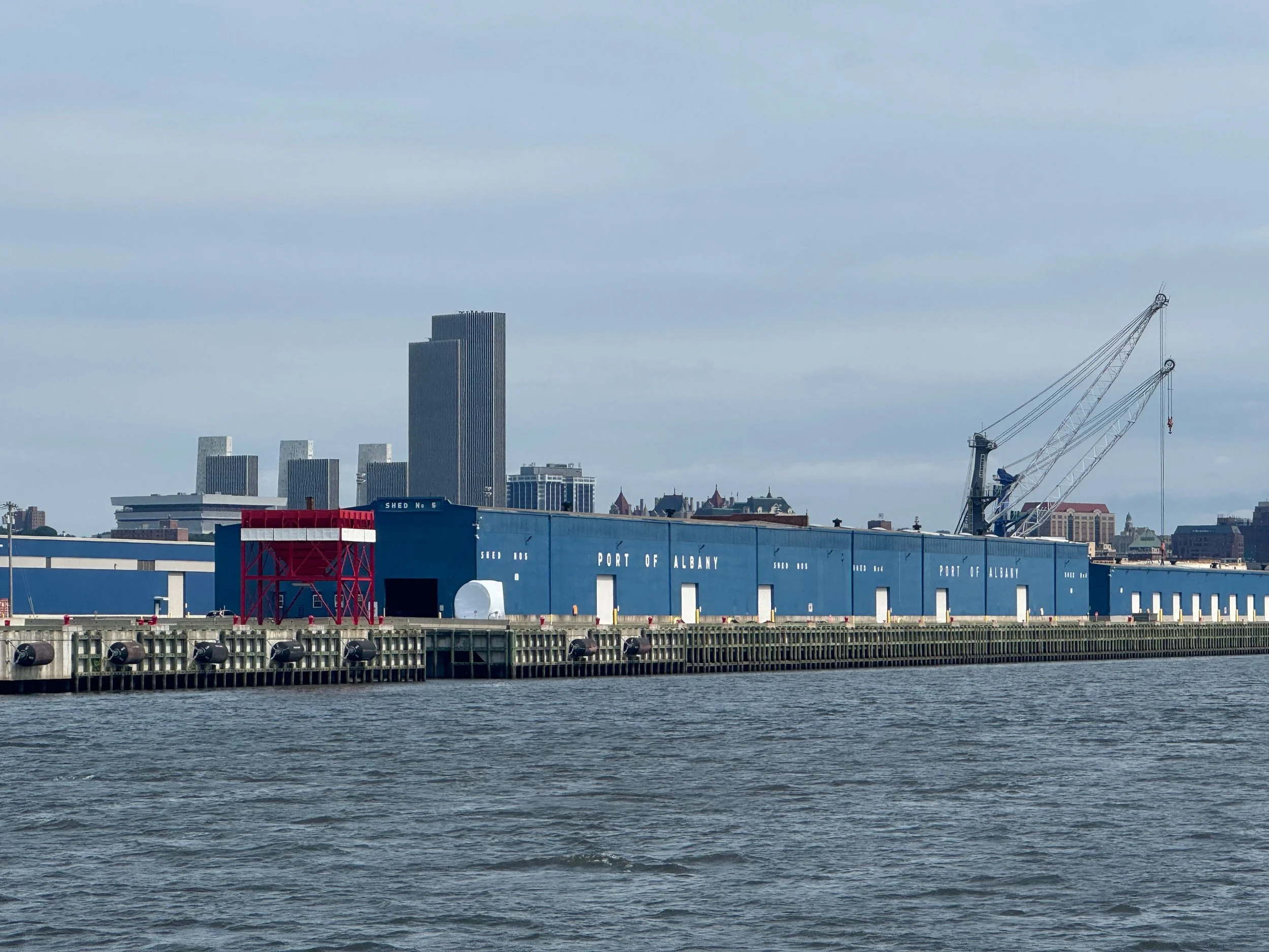 As we cruised up the Hudson from New Baltimore to Troy, we saw everything from flocks of geese lounging in the river to builders of beautiful boats, a World War II destroyer escort, USS SLATER in Albany, the Albany skyline and HUGE piles of scrap metal being loaded into bulk carrier SHIPS (not barges) at the Port of Coeymans to be hauled down the Hudson to who knows where. All we could think of was the effort that went into the making of whatever it was that was now scrap requiring disposal. We also saw some debris and branches up high on the bridge supports that showed how high the water was in the past couple of weeks due to the heavy rains.